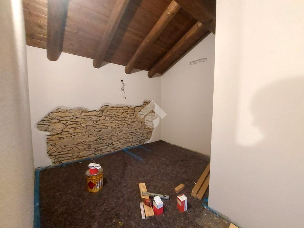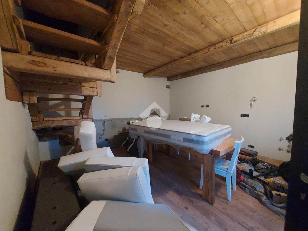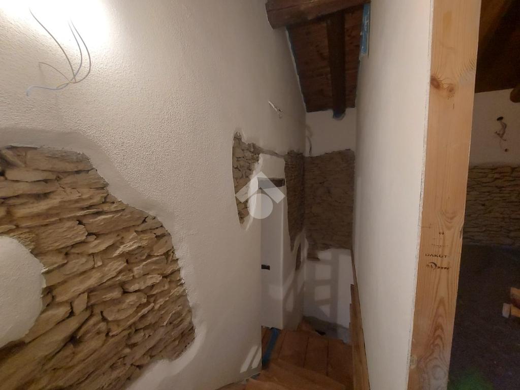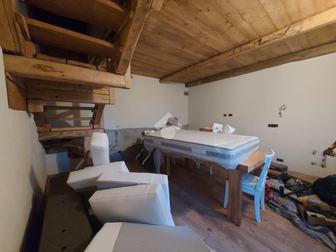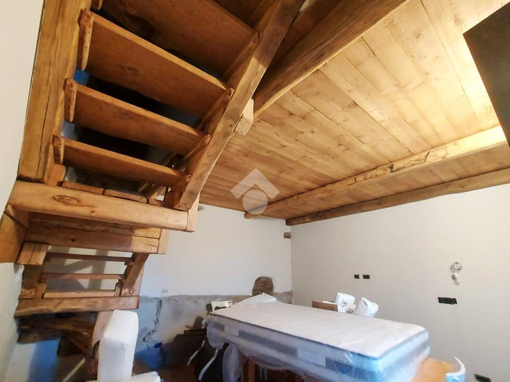 L’abitazione si sviluppa su due livelli e presenta al piano d’ingresso un open space con cucina e soggiorno, ambiente raccolto ma ben organizzato, impreziosito da pavimentazione in legno, soffitto con travi in legno a vista e muri in pietra a vista, elementi che conferiscono calore e carattere all’immobile. Una scala in legno in stile chalet conduce alla zona notte.